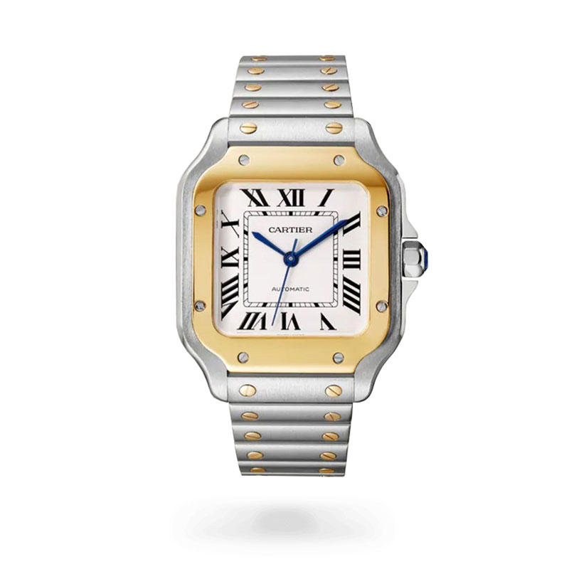 ساعت Cartier Santos de Cartier یکی از نمادینترین مدلهای برند کارتیه است که ترکیب هنرمندانهای از ظرافت فرانسوی و قدرت طراحی صنعتی را ارائه میدهد. نسخهی استیل و طلا این مدل با ترکیب دو رنگ کلاسیک نقرهای و طلایی، ظاهری لوکس و متمایز دارد که هم برای استایل رسمی و هم روزمره ایدهآل است.